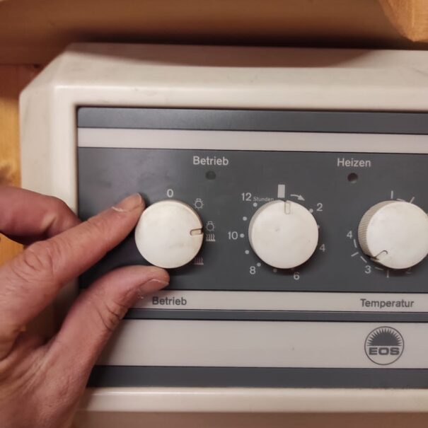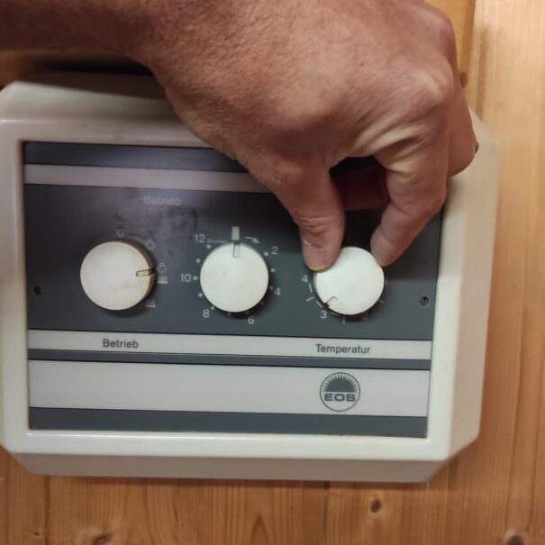 Le bouton de droite sert à régler la température. En position 3 le sauna chauffe à environ 80°C. Le bouton central sert à la programmation et ne sera pas utile pendant votre séjour.